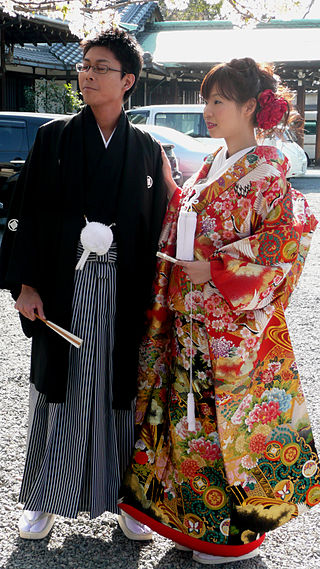 The first picture shown is a man and woman in traditional kimono wear. In the second picture, the couple is wearing yukatas. The third picture shows a hakama.